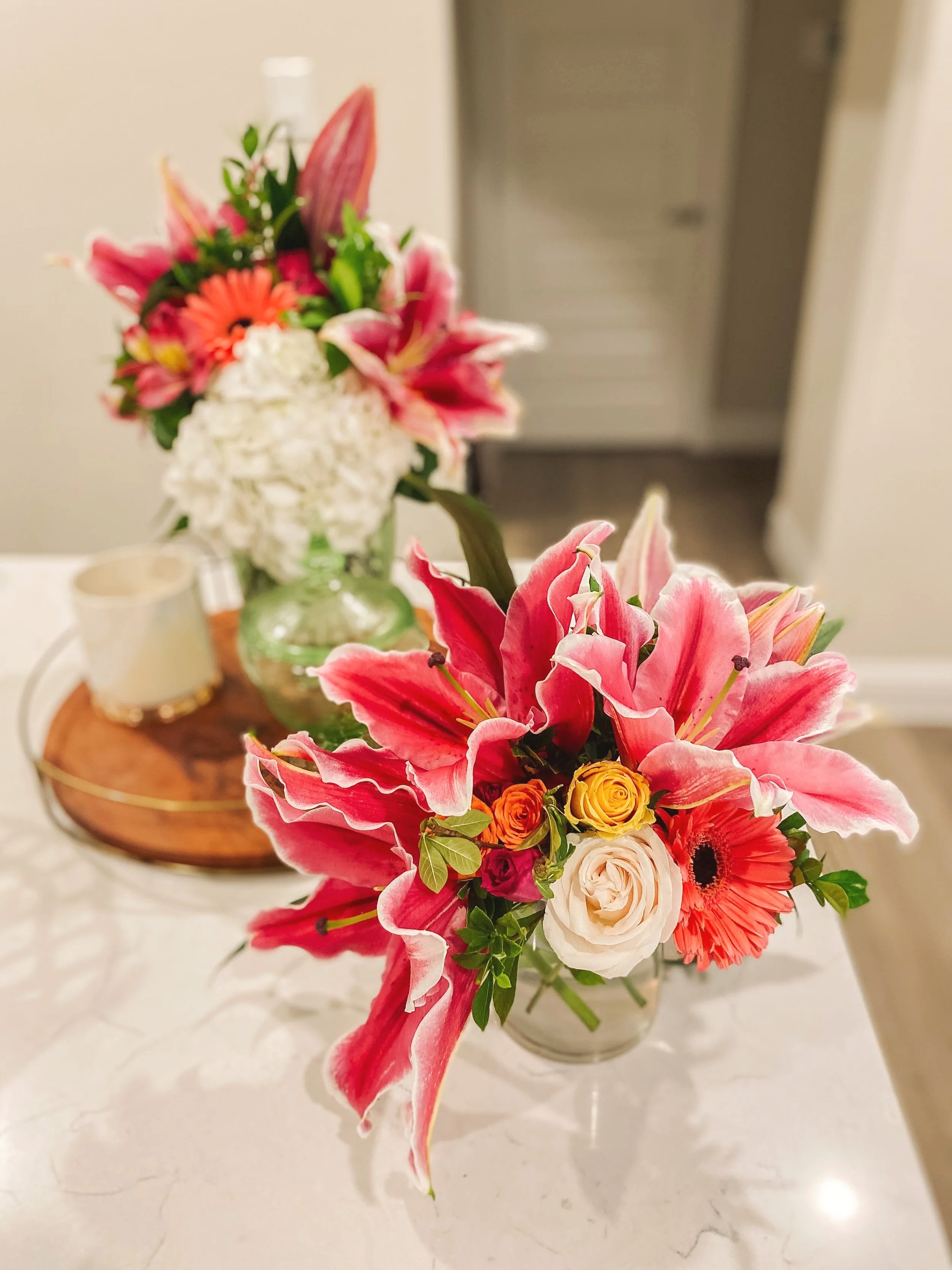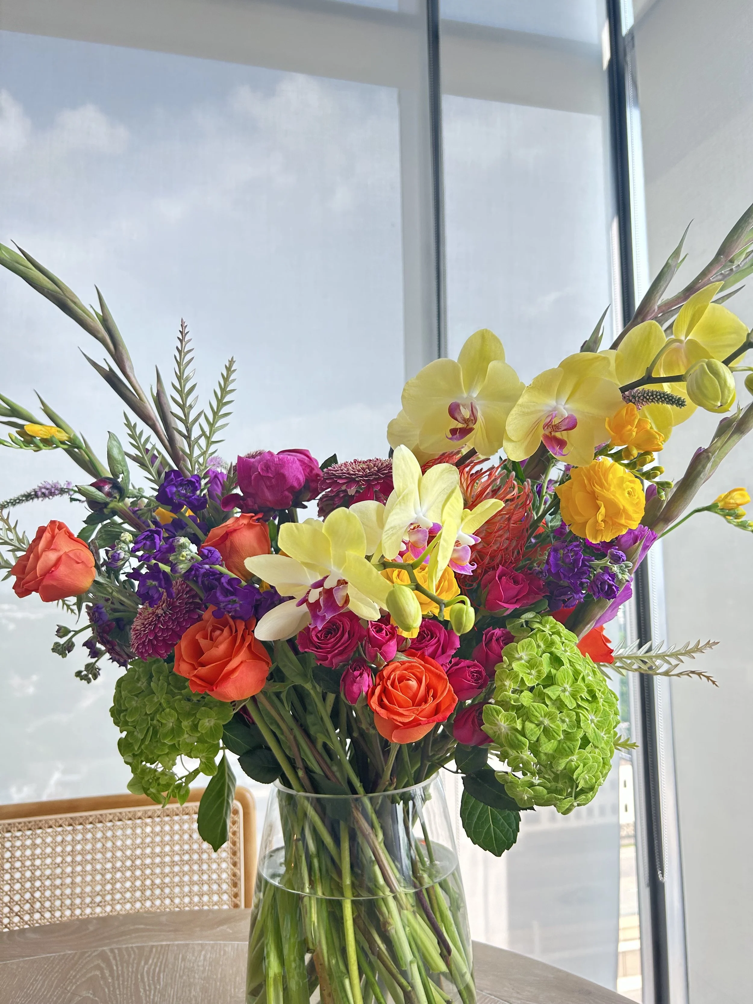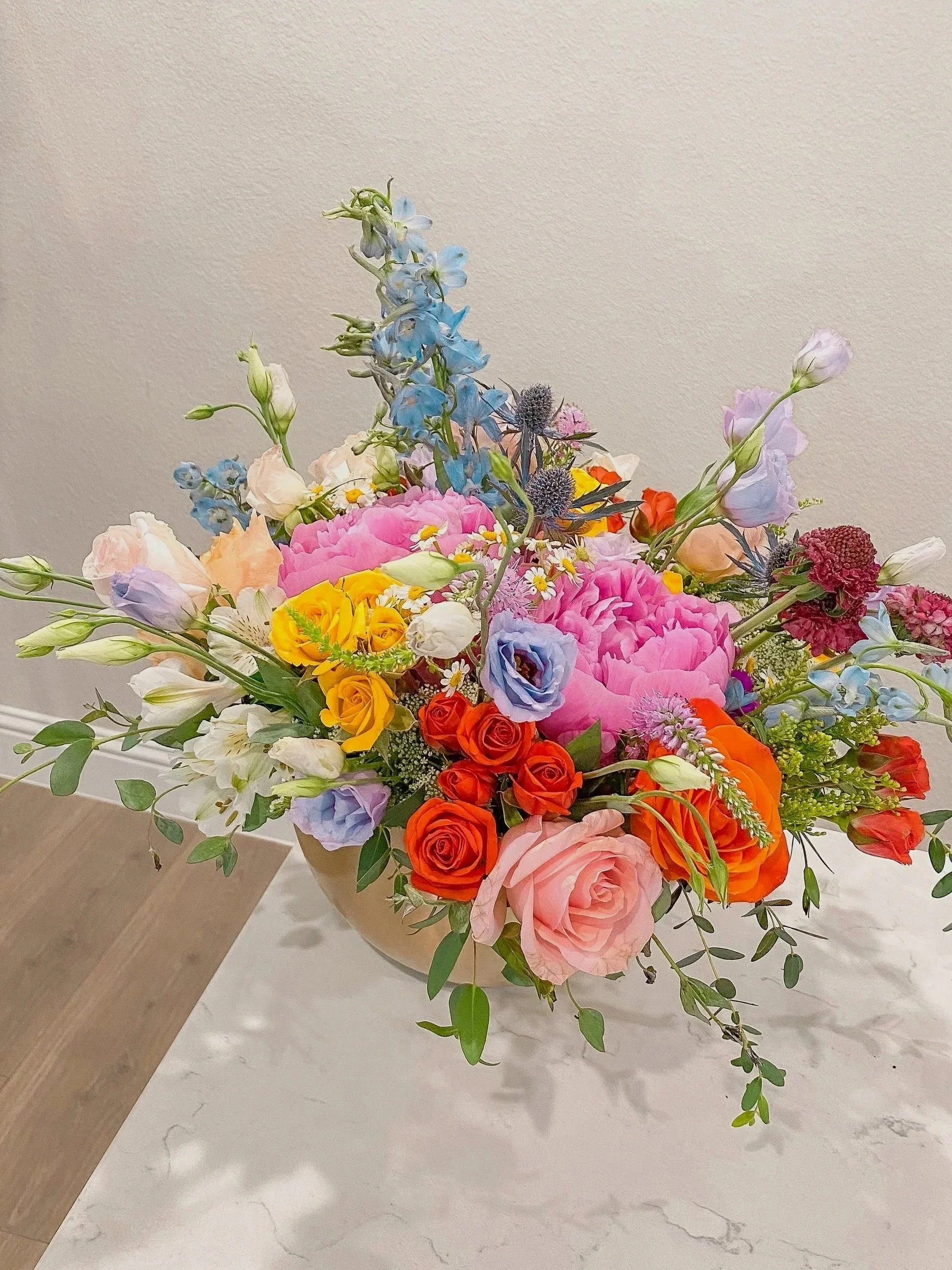 Every arrangement is designer’s choice, allowing for the freshest flowers available and a one-of-a-kind look for each order. The overall feel will be full, lush, and beautifully balanced—perfect for gifting or brightening her home.